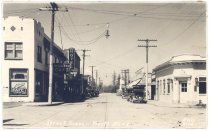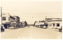 PO.008.0100 - Copy of a newspaper photograph of log truck parade passing through North Bend on North Bend Way with police car in front. On left is Lee Brothers Grocer, right Thompson's Cafe, Drug Store, Masonic Hall, McGrath's Hotel