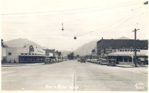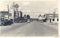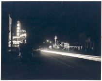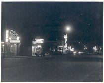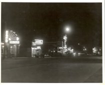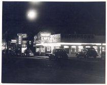 PO.212.0040 - North Bend looking west at night. Taken at the corner of Sunset Highway and Ballarat St. It shows the bright lights of the Little Chalet Cafe, Thompson's Grocery, and McGrath's Cafe.